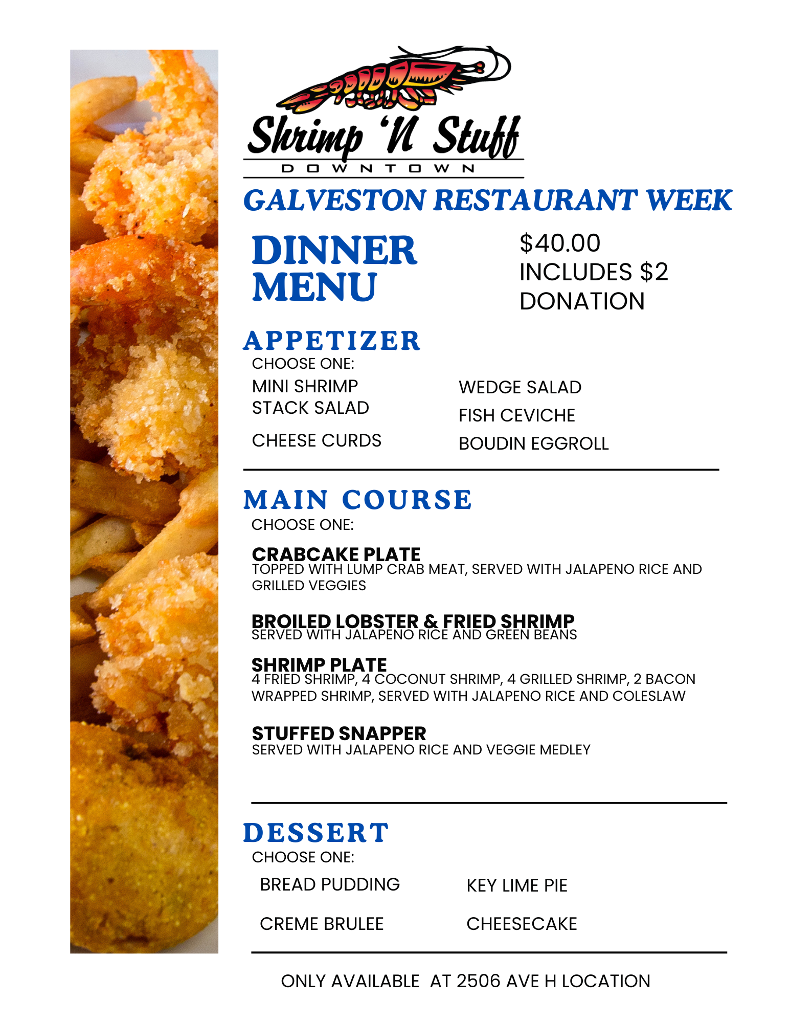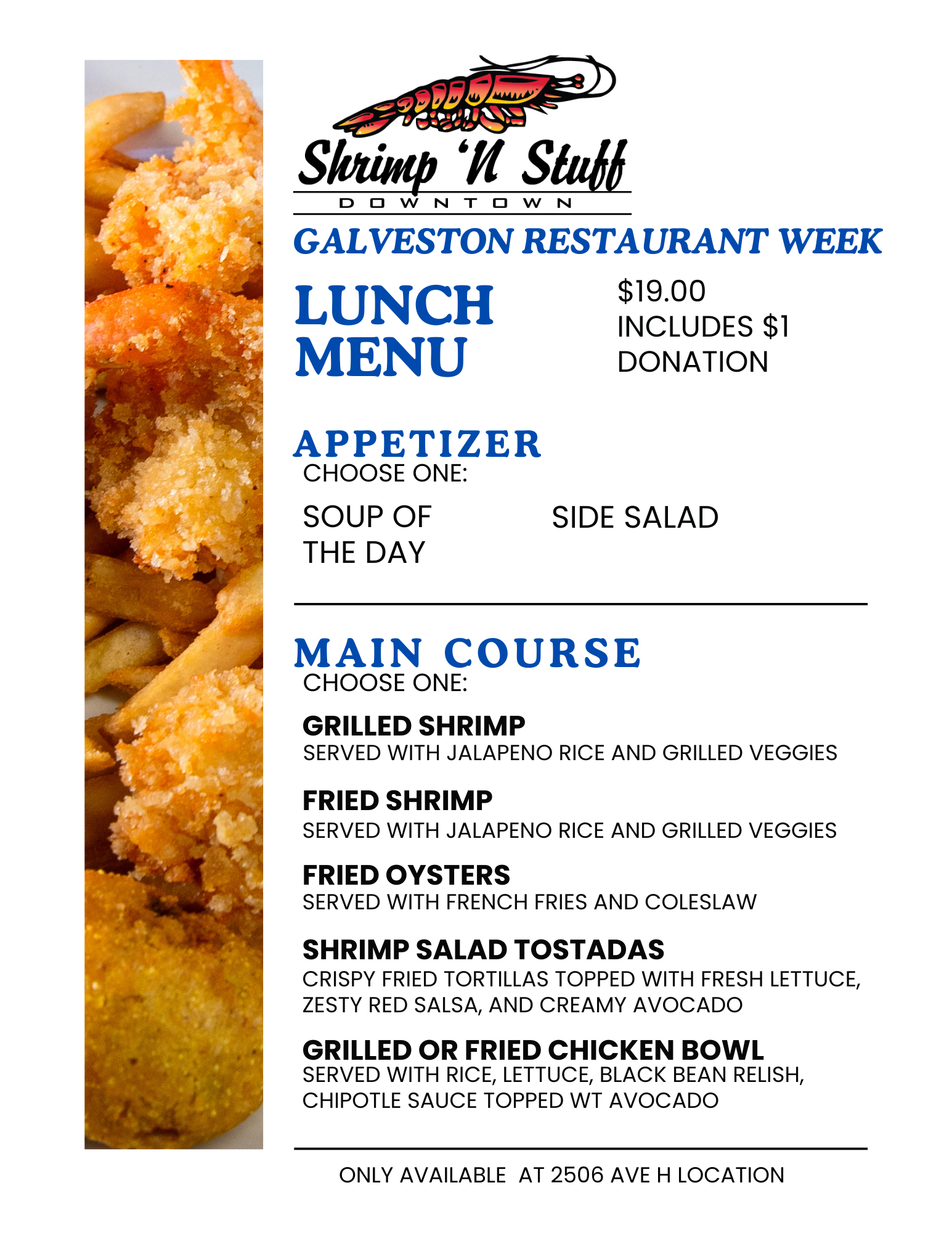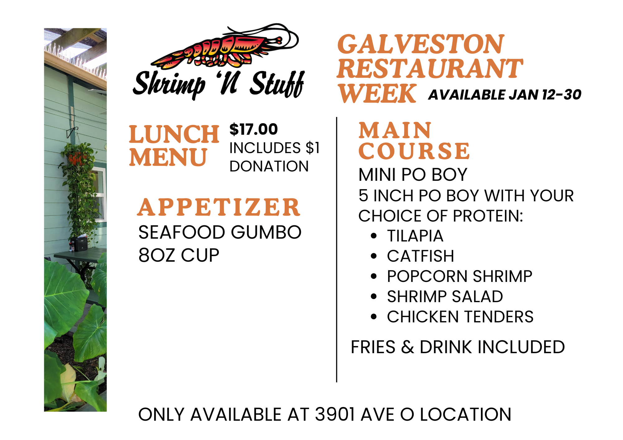 Galveston Restaurant Week is January 12–30 2026, and Shrimp N Stuff is proud to be part of it. Join us at our Shrimp N Stuff 39th Street location or Shrimp N Stuff Downtown and enjoy the same great coastal flavors Galveston has loved for generations. It is the perfect time to dine local, try something new, and savor a true island favorite.